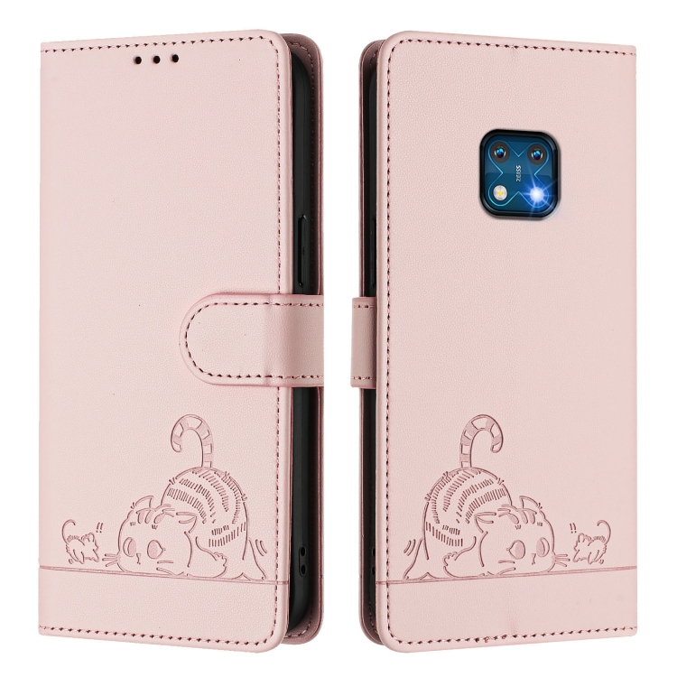 Funda de Cuero Rfid para Nokia Xr20 con Relieve de Gato y Rata y Cordón (Rosa)