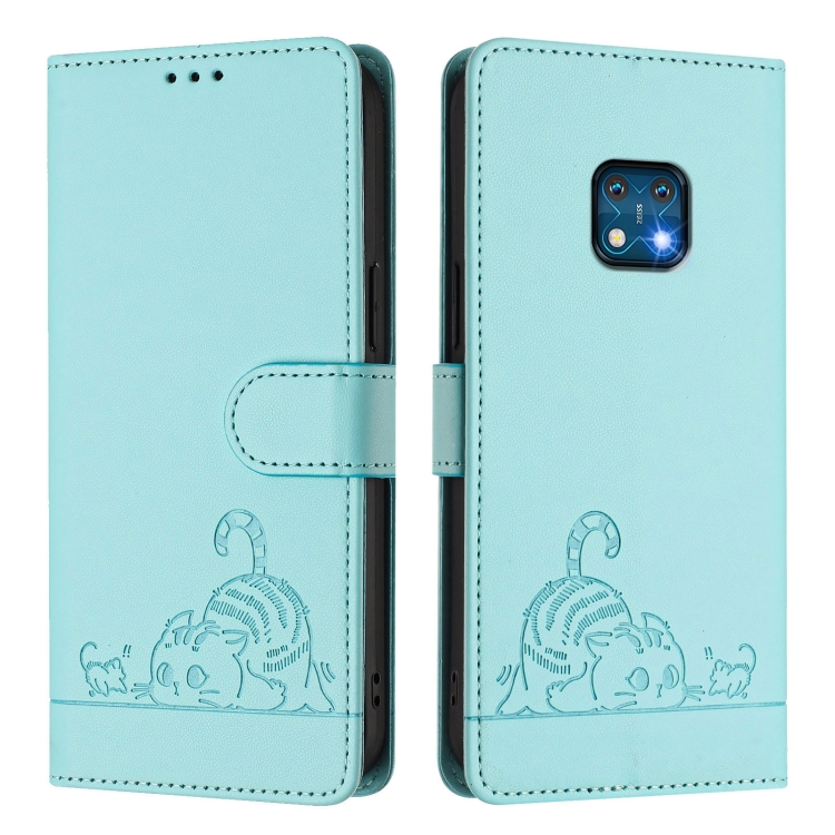 Funda de Cuero Rfid para Nokia Xr20 con Relieve de Gato y Rata y Cordón (Verde Menta)