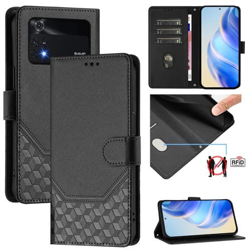Funda de Cuero Rfid con Relieve de Panal para Xiaomi Poco M4 Pro 4G (Negra)