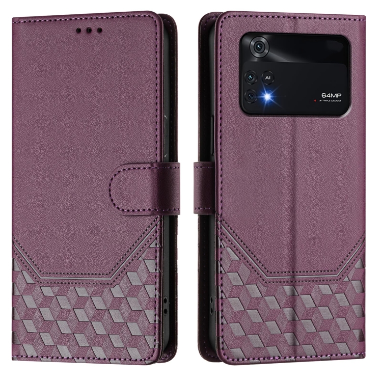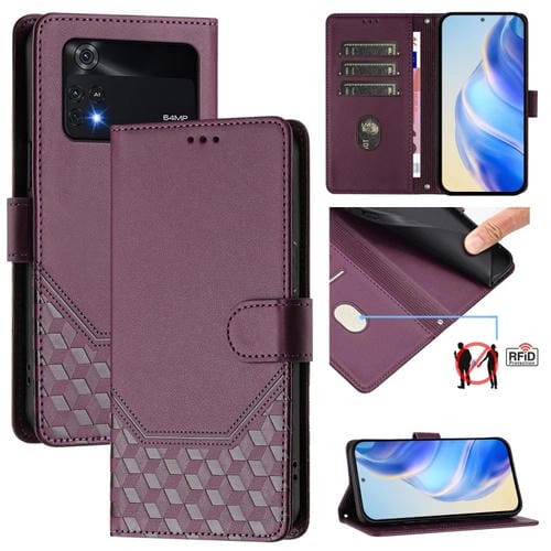 Funda de Cuero Rfid con Relieve de Panal para Xiaomi Poco M4 Pro 4G (Violeta)