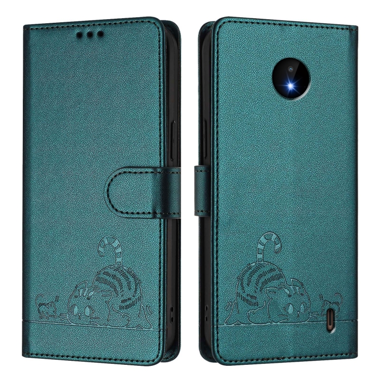 Funda de Cuero Rfid para Nokia C10/C20 con Relieve de Rata y Gato y Cordón (Verde Pavo Real)