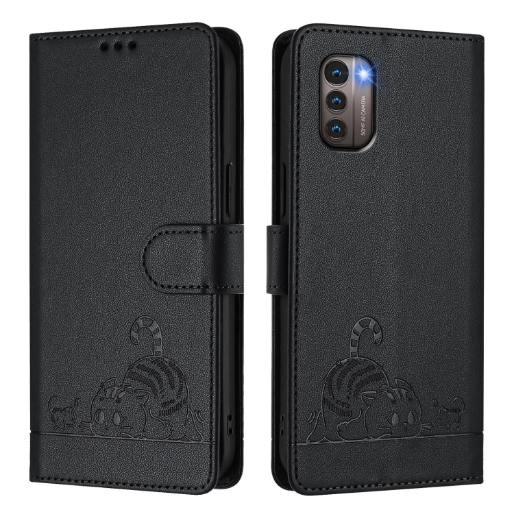 Funda de Cuero Rfid con Relieve de Rata y Gato para Nokia G21/G11 con Cordón (Negro)