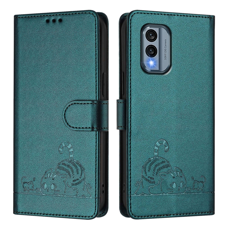 Funda de Cuero Rfid con Relieve de Rata y Gato para Nokia X30 5G con Cordón (Verde Pavo Real)