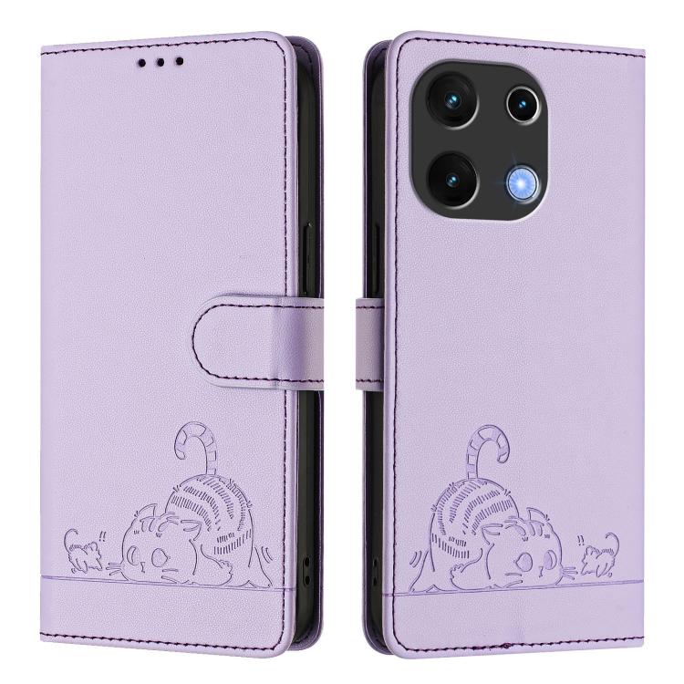 Funda de Cuero Rfid para Umidigi Note 100 con Relieve de Rata y Gato y Cordón (Morado)