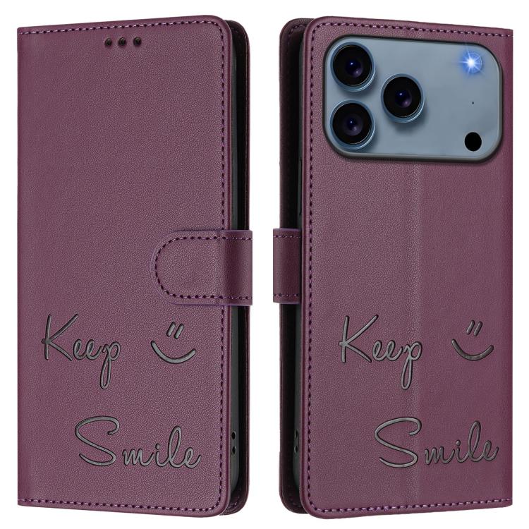 Funda de cuero RFID con relieve de sonrisa para iPhone 17 Pro Max (violeta)