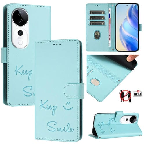 Funda de Cuero Rfid con Relieve de Sonrisa para Teléfono Vivo S19 Pro (Verde Menta)