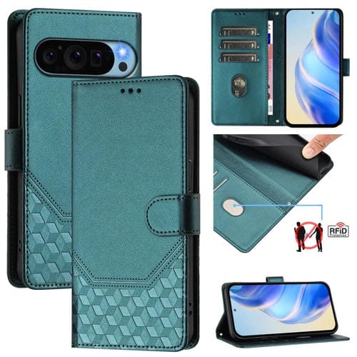 Funda de Cuero Rfid con Relieve en Panal para Google Pixel 9 y 9 Pro (Verde Pavo Real)