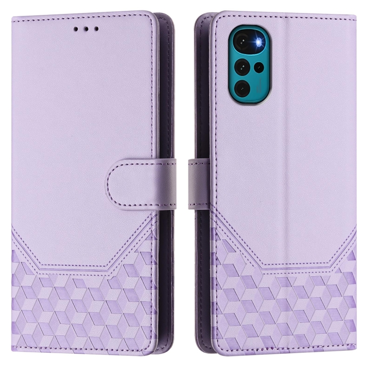 Funda de Cuero Rfid con Relieve en Panal para Motorola Moto E32 India/G22 4G (Morado Claro)