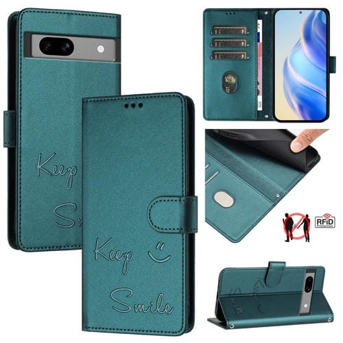 Funda de Cuero Rfid con Relieve Sonriente para Google Pixel 7A (Verde Pavo Real)