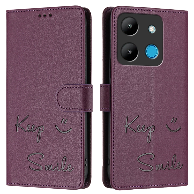 Funda de Cuero Rfid con Relieve Sonriente para Infinix Smart 7 HD y Smart 7 Plus (Violeta)