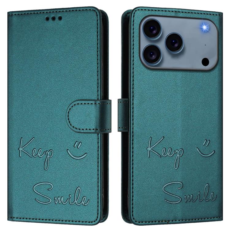 Funda de cuero RFID con relieve sonriente para iPhone 17 Pro (verde pavo real)