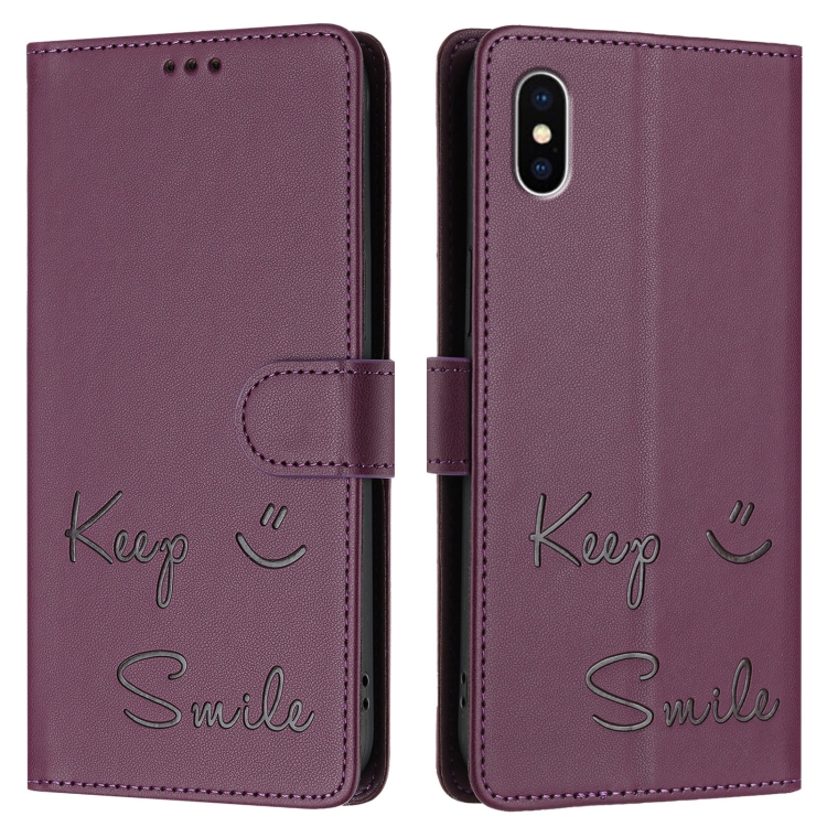 Funda de Cuero Rfid para iPhone X/Xs con Relieve Sonriente (Violeta)