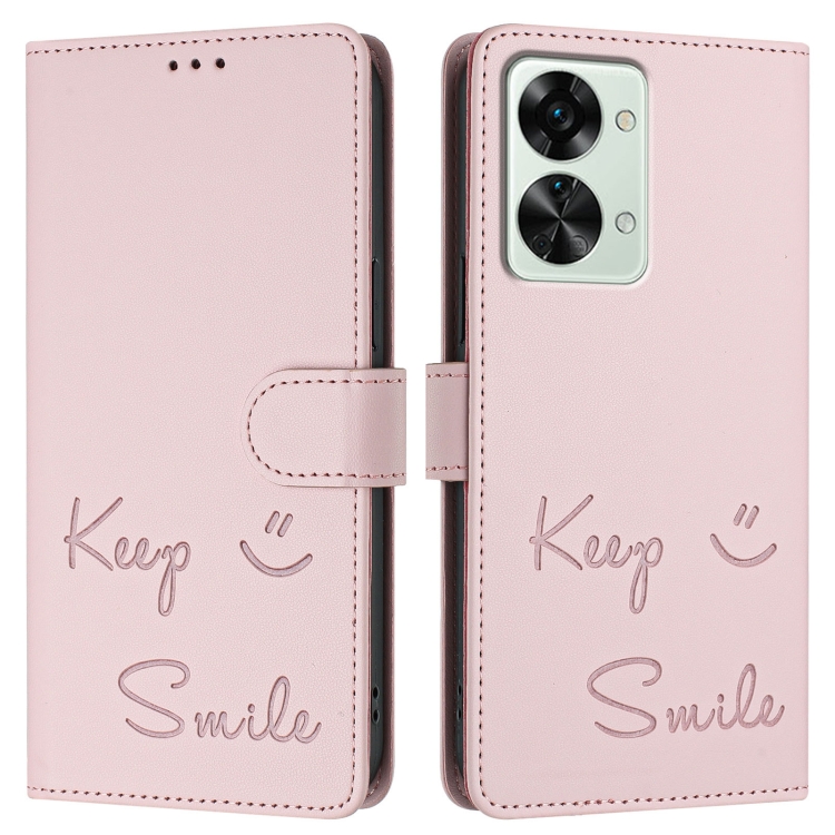 Funda de Cuero Rfid con Relieve Sonriente para OnePlus Nord 2T (Rosa)