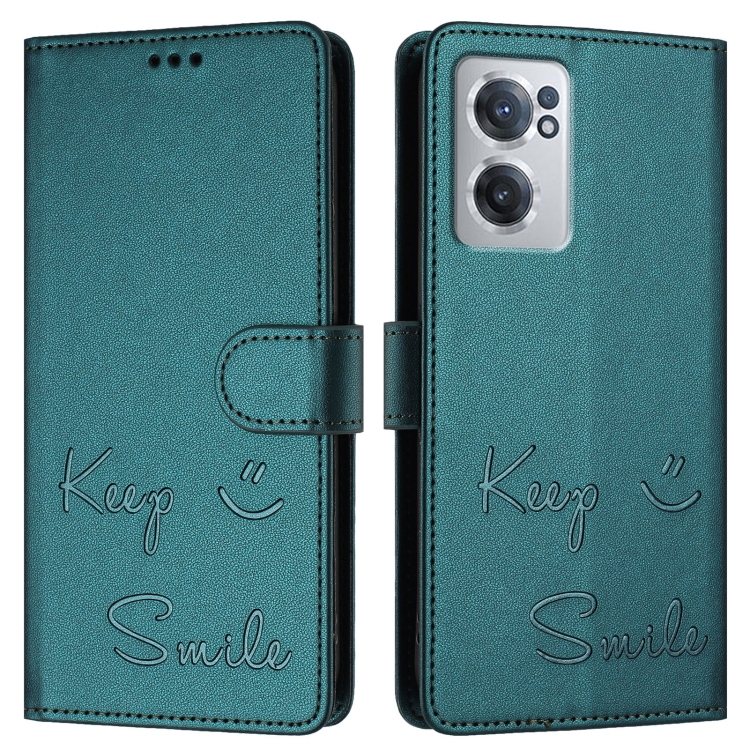 Funda de Cuero Rfid con Relieve Sonriente para OnePlus Nord Ce 2 5G (Verde Pavo Real)