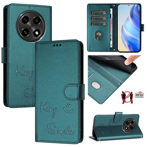 Funda de Cuero Rfid con Relieve Sonriente para Oppo A2 Pro 5G (Verde Pavo Real)
