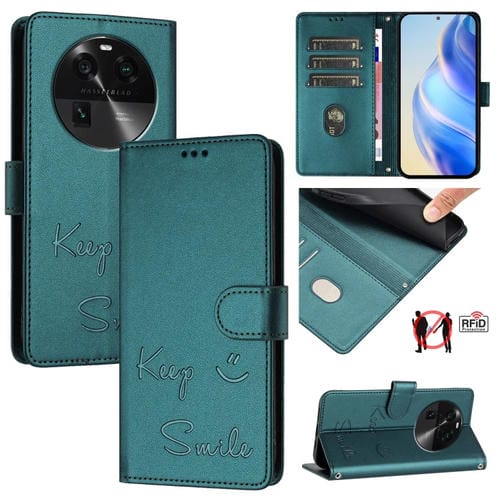 Funda de Cuero Rfid con Relieve Sonriente para Oppo Find X6 Pro (Verde Pavo Real)
