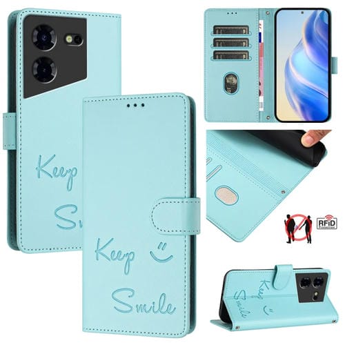 Funda de Cuero Rfid para Tecno Pova 5 Pro 5G con Relieve Sonriente (Verde Menta)