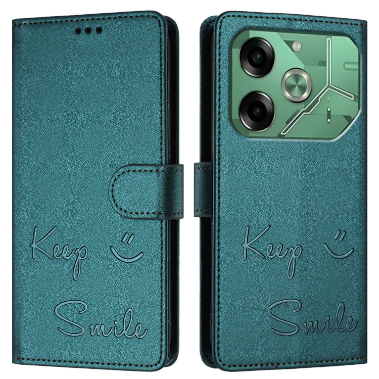 Funda de Cuero RFID con Relieve Sonriente para Tecno Pova 6 4G (Verde Pavo Real)
