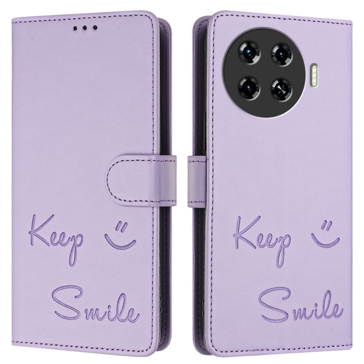 Funda de Cuero Rfid para Tecno Spark 20 Pro+ con Relieve Sonriente (Morado Claro)