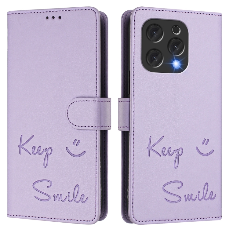 Funda de Cuero Rfid con Relieve Sonriente para Teléfono Doogee N55 Plus (Morado Claro)