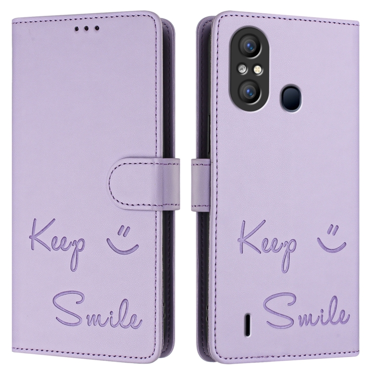 Funda de Cuero Rfid con Relieve Sonriente para Teléfono Itel A58/A49 (Morado Claro)