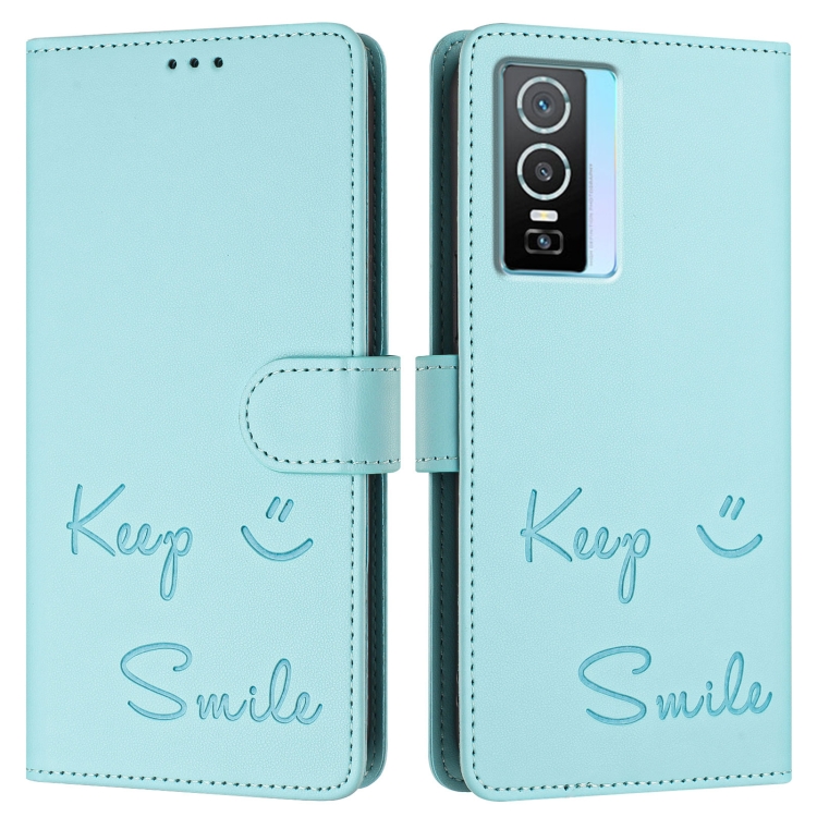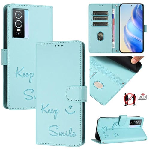 Funda de Cuero Rfid con Relieve Sonriente para Vivo Y76 5G (Verde Menta)