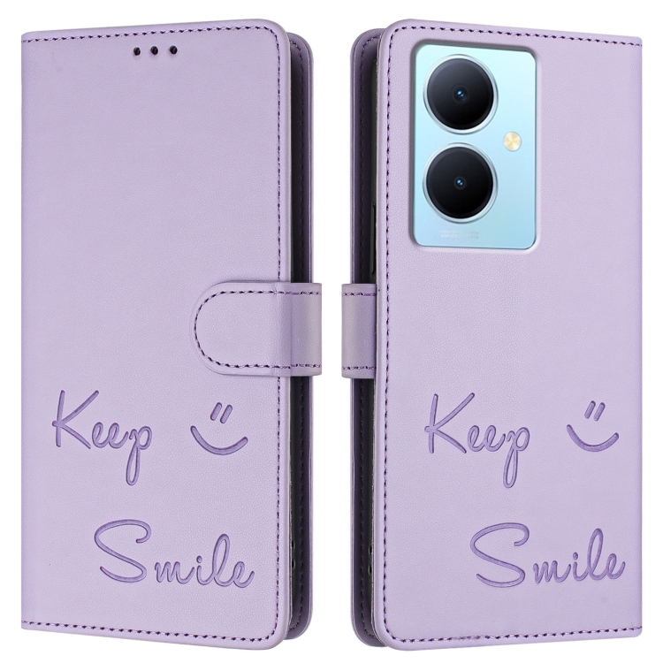 Funda de Cuero Rfid con Relieve Sonriente para Vivo Y78 5G Global / V29 Lite (Morado Claro)