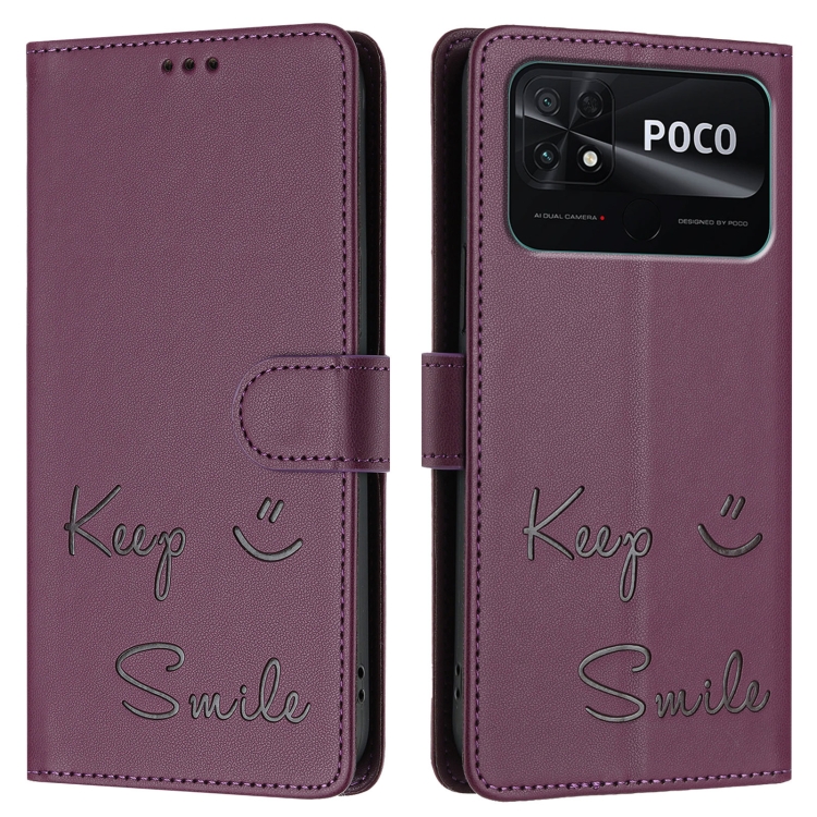 Funda de Cuero Rfid con Relieve Sonriente para Xiaomi Poco C40 (Violeta)