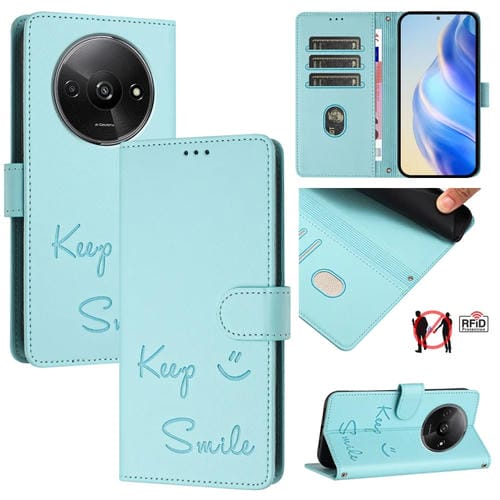 Funda de Cuero Rfid con Relieve Sonriente para Xiaomi Poco C61 (Verde Menta)