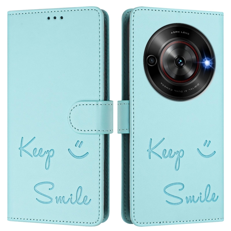 Funda de Cuero RFID con Relieve Sonriente para ZTE Blade A75 5G (Verde Menta)