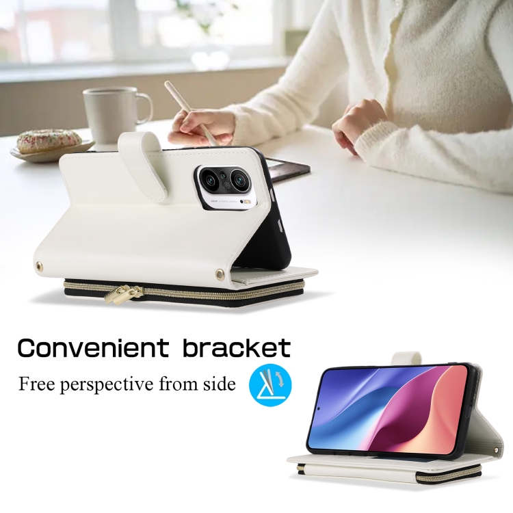 Funda de Cuero Tipo Billetera con Cremallera Completa y Diseño Rombal para Xiaomi Poco F3 (Blanca)