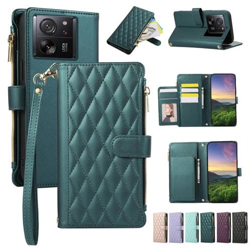 Funda de Cuero Tipo Billetera con Cremallera Rombal para Xiaomi 13T/13T Pro (Verde)
