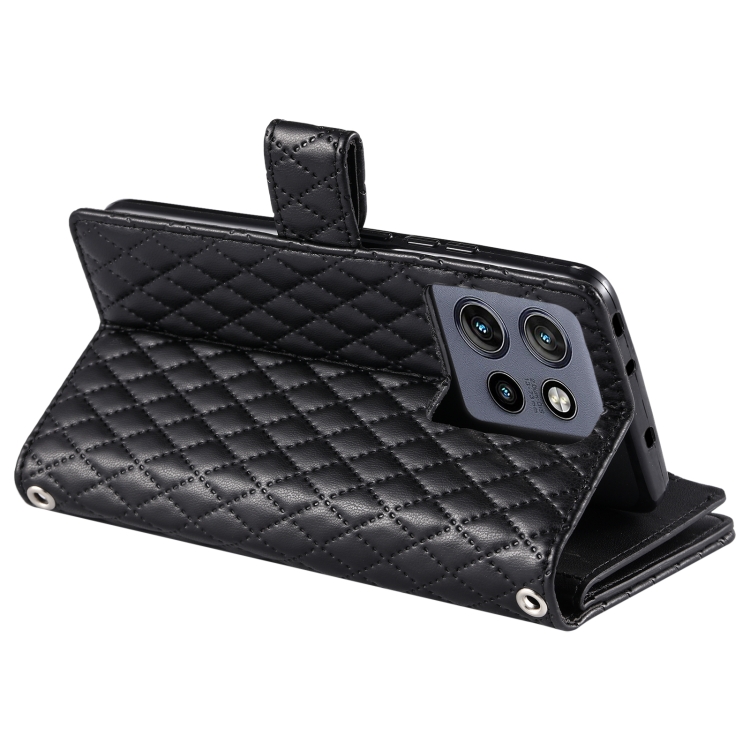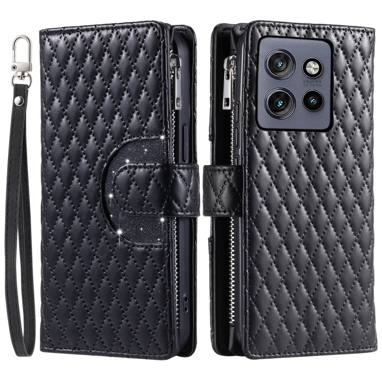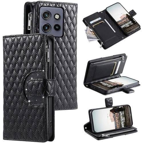 Funda de Cuero Tipo Billetera con Cremallera y Celosía Brillante para Motorola Edge 50 Neo (Negra)