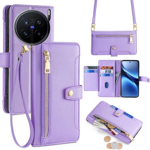 Funda de Cuero Tipo Cartera con Cremallera y Textura de Oveja para Vivo X200 Pro 5G (Morado)