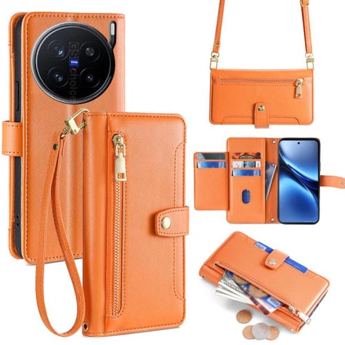 Funda de Cuero Tipo Cartera con Cremallera y Textura de Oveja para Vivo X200 Pro 5G (Naranja)