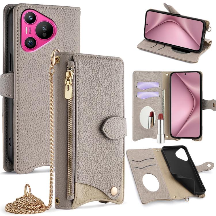 Funda de Cuero Tipo Lichi con Forma de Cola de Pez y Cadena Cruzada para Huawei Pura 70 (Gris)