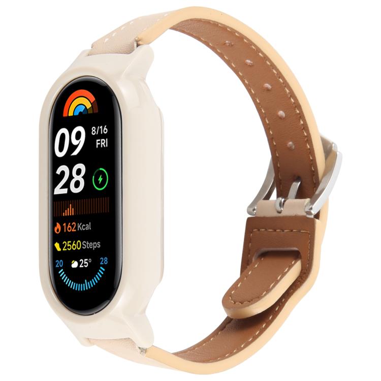 Funda de PC para Xiaomi Smart Band 9 con correa de cuero de microfibra integrada (beige + blanco retro)