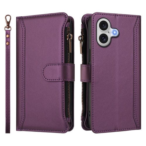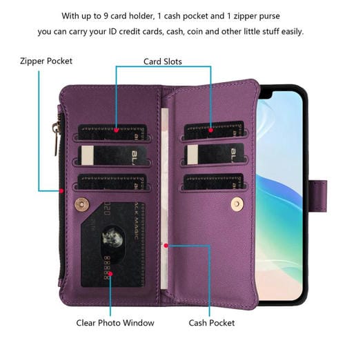 Funda de piel con cierre magnético para iPhone 17, 9 ranuras para tarjetas, cremallera y correa de mano (morado)