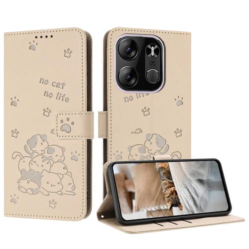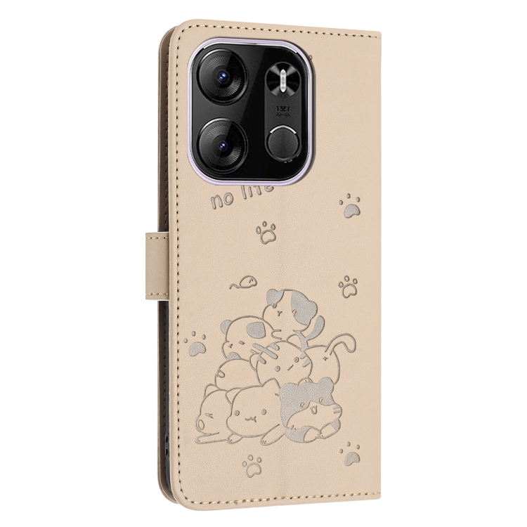 Funda de Piel para Tecno Spark Go 2023 con Diseño de Gatito en Relieve y Cordón (Beige)
