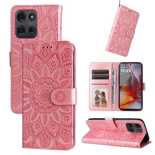 Funda de Piel Motorola Moto G75 5G con Diseño de Girasol en Relieve (Oro Rosa)