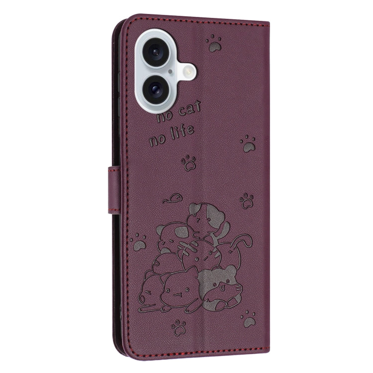Funda de Piel para iPhone 16 con Forma de Gatito en Relieve y Cordón (Rojo Vino)