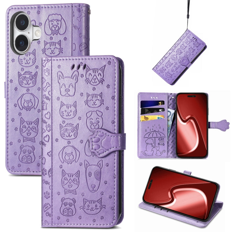 Funda de Piel con Relieve de Gato y Perro para iPhone 16 (Morado)