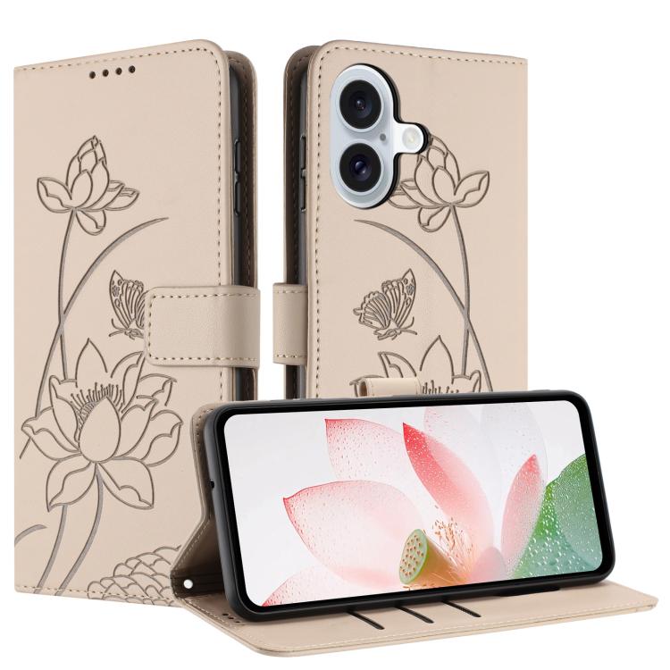 Funda de piel con relieve de loto para iPhone 17 con cordón (beige)