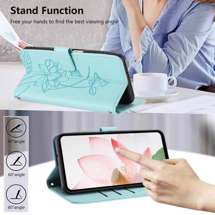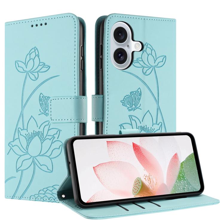 Funda de piel con relieve de loto para iPhone 17 con cordón (verde)
