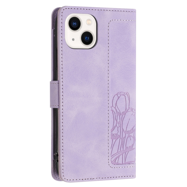 Funda de Piel con Relieve de Tulipanes para iPhone 13 Mini con Cordón (Morado)