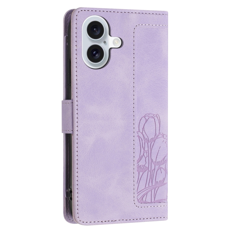 Funda de Piel con Relieve de Tulipanes para iPhone 16 Plus con Cordón (Morado)