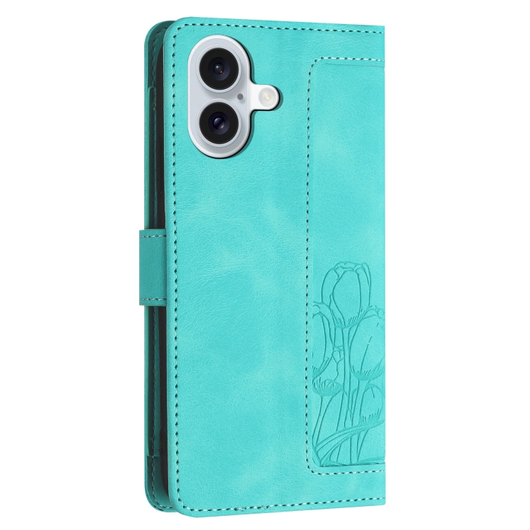 Funda de Piel con Relieve de Tulipanes para iPhone 16 Plus con Cordón (Verde)