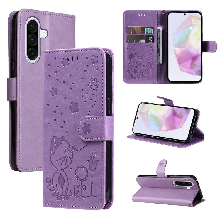 Funda de piel con tapa y diseño de gato y abeja para Samsung Galaxy A36 5G / M56 5G (morada)