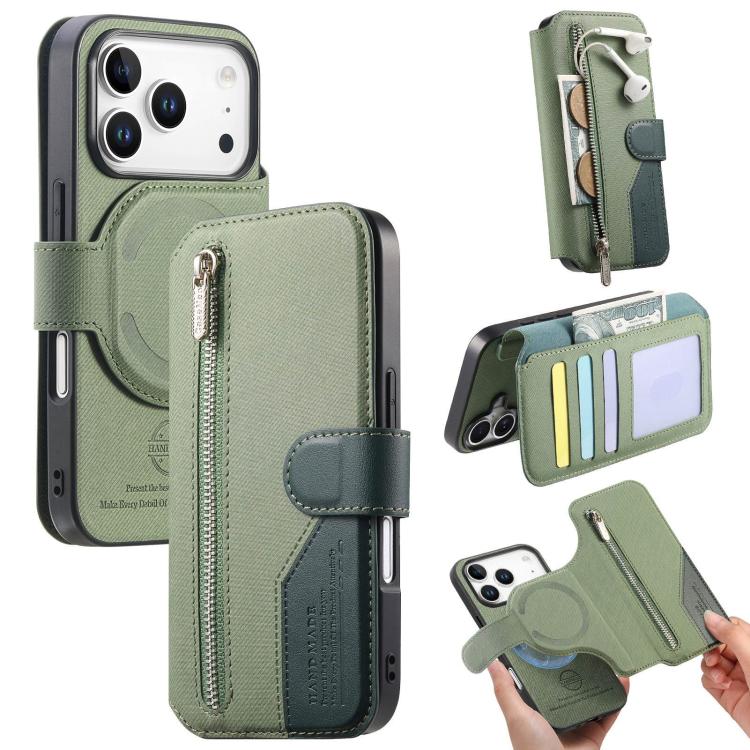 Funda de piel para iPhone 17 Pro, de tela de sarga, con MagSafe, RFID, antirrobo y cremallera (verde).
