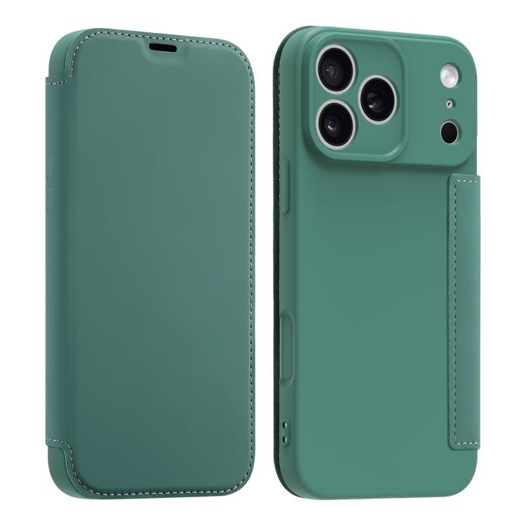 Funda de piel sintética con tacto similar a la piel líquida para iPhone 17 Pro Max con ranuras para tarjetas (verde oscuro)